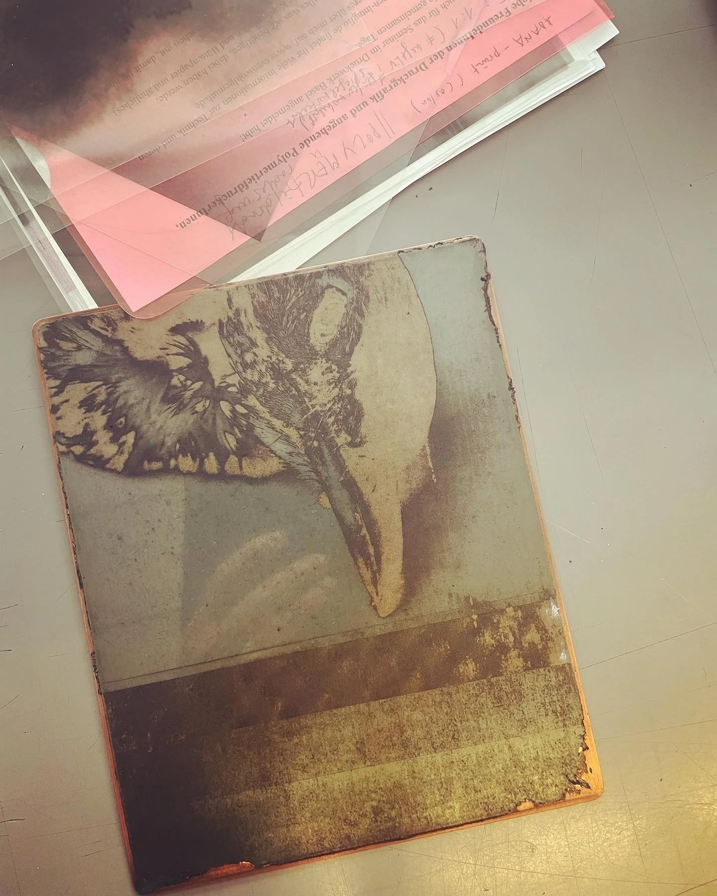 bad news / gumprint&painting / 2025 The starting point for this series of prints are rasterised media images that confront us daily with disasters: war, displacement, flooding, forest fires, stranded whales. This “bad news” forms the basis for gum prints that capture the harshness and unconditional nature of the reality depicted. A second layer of pink acrylic paint is applied over this. It obscures, softens, covers up – and allows only a vague glimpse of the original image. The interplay of these two layers creates a fascinating tension: the image of disaster remains present, but is softened, aestheticised, shifted into the realm of the ‘bearable’. The series is a commentary on our collective ability to repress everyday issues. With our ‘rose-tinted glasses,’ we create a distance from what overwhelms us. Instead of intervening, getting involved or taking responsibility, we distance ourselves from the demanding reality – so that it no longer seems quite so uncomfortable. It is in this tension between relentless reality and whitewashing that the series unfolds its effect: as a quiet but powerful statement about perception, responsibility and dealing with the crises of our time.